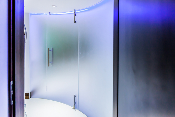 Our client wanted to create a sandblasted curved glass wall and door to reflect the line of the spiral staircase in the utility area leading through to the gymnasium in this beautiful high-tech contemporary home.